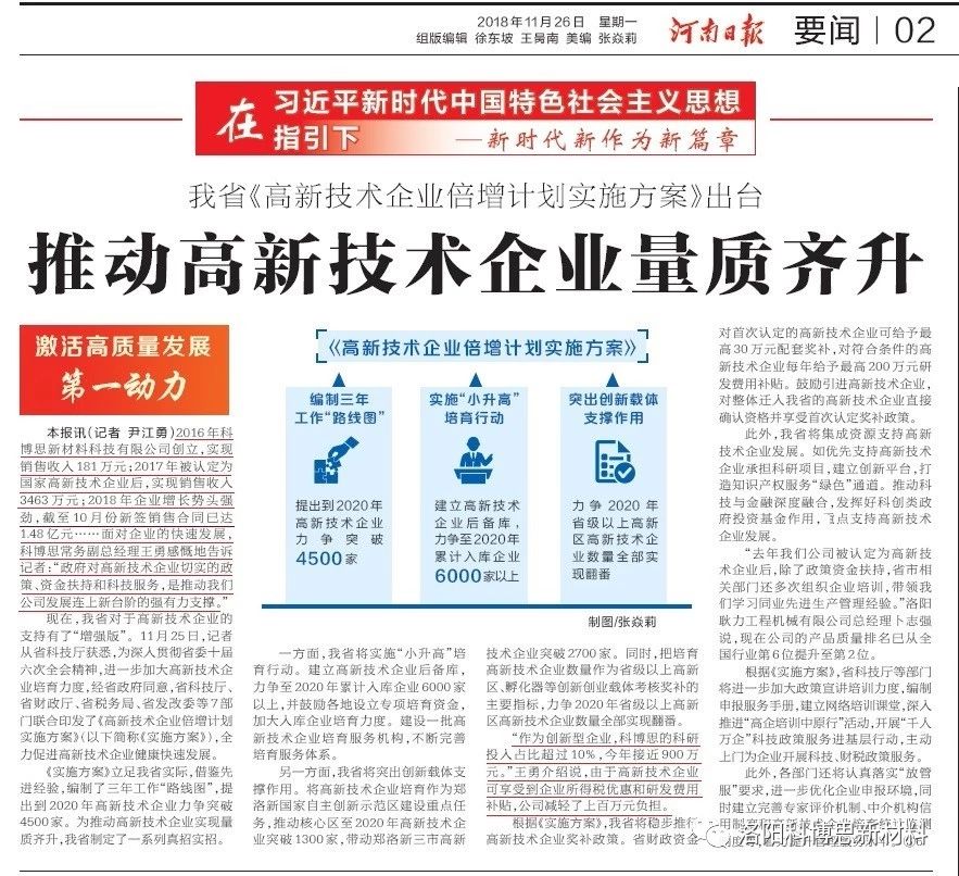 官宣:推動高新技術(shù)企業(yè)量質(zhì)齊升——洛陽科博思新材料科技有限公司接受《河南日報》專訪